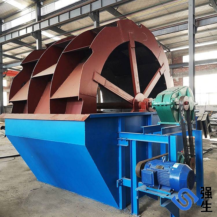 電機(jī)通過三角帶、減速機(jī)、齒輪減速后帶動葉輪緩慢轉(zhuǎn)動,砂石由給料槽進(jìn)入洗槽中,在 葉輪的帶動下翻滾,并互相研磨,除去覆蓋砂石料表面的雜質(zhì),同時破壞包覆砂粒的水汽層,以利于脫水;同時加水,形成強(qiáng)大水流,及時將雜質(zhì)及比重小的異物帶 走,并從溢出口洗槽排出,完成清洗作用。干凈的砂石料由葉片帶走,砂石料從旋轉(zhuǎn)的葉輪倒入出料槽,完成砂石料的清洗作用。